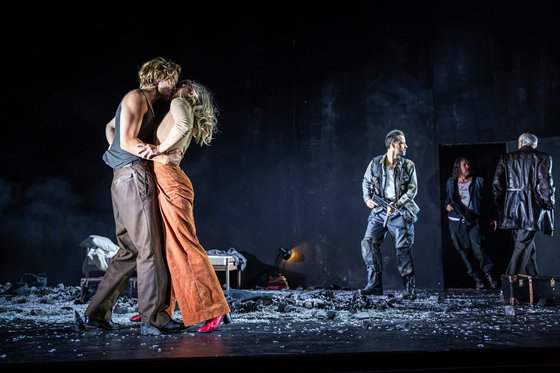 Regisseur David Bösch verlässt sich auf die inhärente Spannung des existenzialistischen Psychothrillers, den er leicht gestrafft in einem minimalistisch-düsteren Setting spielen lässt. Zwischen den Szenen dreht sich die Bühne zu Chansons, effektvoll gesungen von Johanna Mahaffy. Ihr gebührt besonderes Lob innerhalb des ausgezeichneten Trios (Nils Arztmann & Günter Franzmeier). Die recht unzeitgemäße Frauenfigur, die Sartre schuf, bringt sie überzeugend zwischen Hysterie und Kalkül rüber.