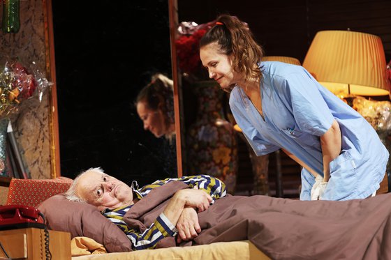 Meyer ist Meyer als grantelnder Willie Clark. Föttinger ist Föttinger als famos wütender Al Lewis. Präzise ist jede Geste, jedes Wort gesetzt. Sie lassen die Beklemmung spüren, die zwei ehemalige Bühnenpartner empfinden, die sich vor mehr als zehn Jahren unversöhnlich entzweit haben. Nach der Pause sind sie nicht mehr zu halten, ein fulminantes Feuerwerk an Emotionen, wenn Lewis seinen Clark besucht, der einen Herzinfarkt überstanden hat. Mit Frank Sinatras „My Way“ singen sie sich bewegend ihrer gemeinsamen Zukunft im Heim für pensionierte Schauspieler entgegen. Dominic Oley nimmt als rühriger Neffe und Agent ein, Larissa Fuchs zeigt authentisch mit einer Art slawischem Akzent eine Krankenpflegerin.