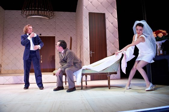 Kreihsl inszeniert im kargen Dreißigerjahre-Bühnenbild von Hugo Gretler genau, was Feydeau ausmacht. Vaudeville mit hohem Tempo: Tür auf, Tür zu! Wettläufe, bei denen durchgeknallte Typen aufeinander Jagd machen. Eine Welt kleinbürgerlicher Simultanten, Vortäuscher, Notlügner, in der jeder auf seine Art die angesagte Trauung des Schönlings mit der exentrischen Tochter der Baronin Duverger - eine Hochzeit aus reiner Liebe zum Geld - weitertreibt. Und im Mittelpunkt ein weiblicher Calafatti Lucette: verrückt, verliebt, berechnend, intrigant, eine flatternde Diva voll Sehnsucht nach Glück.