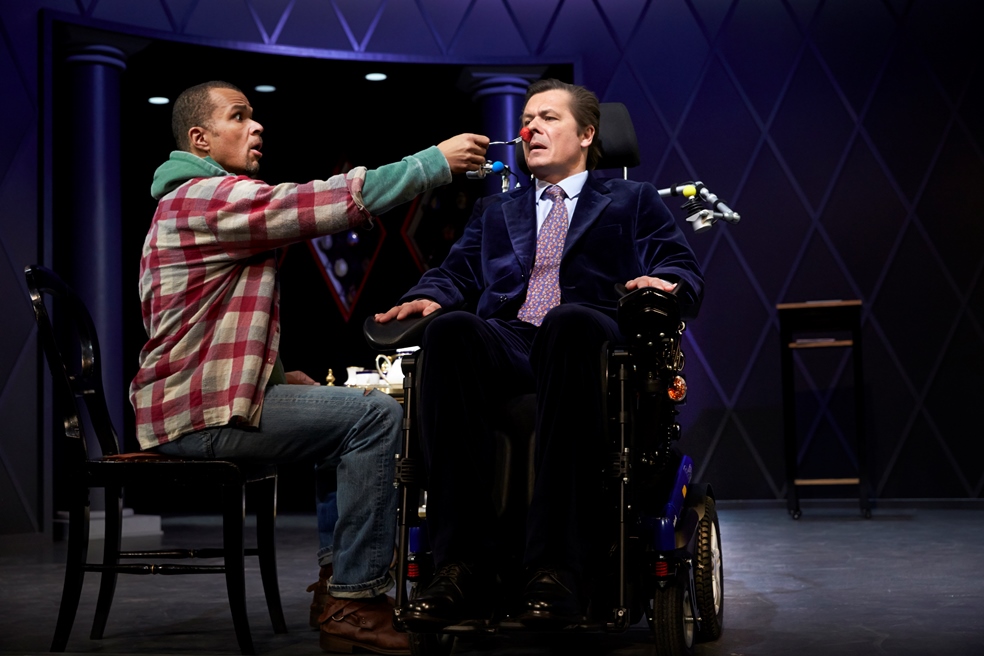 Dangl fährt mit seinem mundbetriebenen Rollstuhl flott herum, als hätte er nie etwas anderes getan. Sein Spiel muss sich notgedrungen aufs Gesicht konzentrieren und das gelingt ihm formidabel.(…)Okonkwo ist ein sympathischer, lässiger Driss, der zwar im direkten Vergleich mit dem Film ein bisschen Rohheit vermissen lässt, aber dafür über bestechendes Pointentiming verfügt.(…)